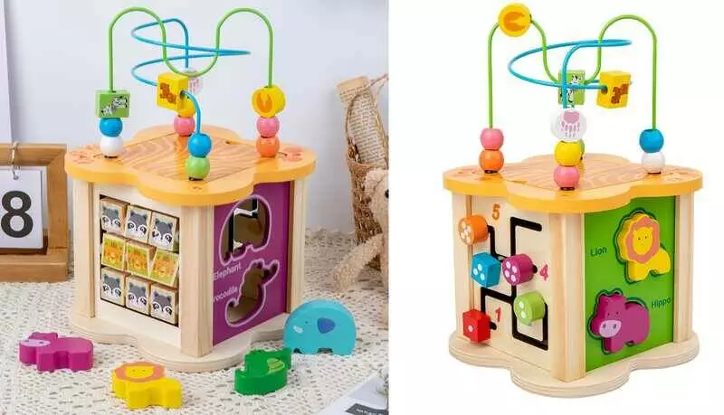 Куб логічний C 75590 (24) дерев’яний, годинник, пальчикові лабіринти, сортер, слова англійською мовою, в коробці