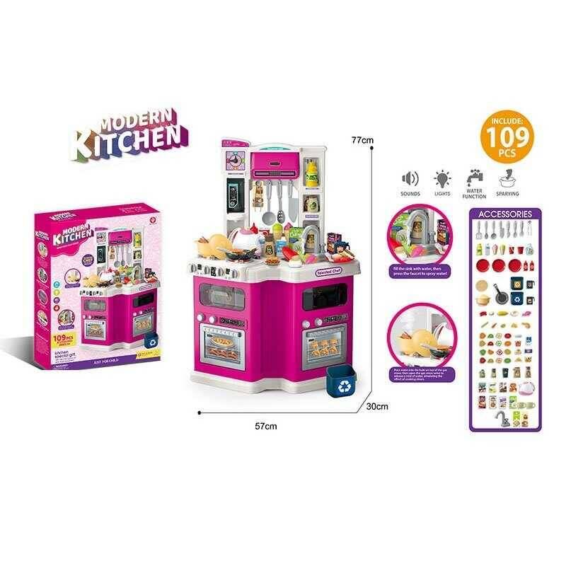 Кухня 922-175 (6) 109 елементів, розмір:57х30х78.5 см, підсвічування, звук, парогенерація, помпова подача води, муляжі продуктів, посуд, в коробці