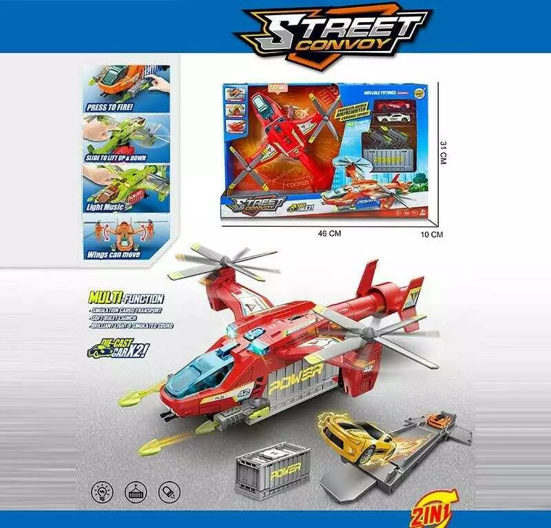 Літак MH 613 (24) підсвічування, звуки, 2 металопластикові машинки, 2 механічних запускачі, контейнер, механічний підіймач, в коробці