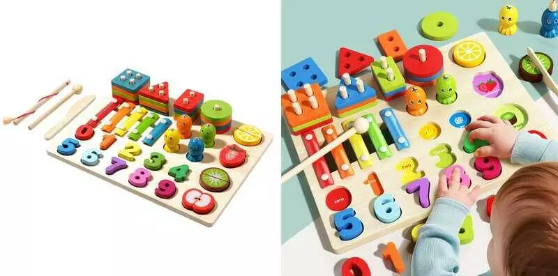 Логічна дерев’яна дошка C 75574 (20) ксилофон, продукти на липучках, магнітна риболовля, кілочки, сортер з цифрами, в коробці