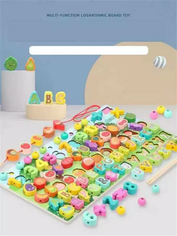 Логічна дерев’яна дошка C 67048 (20) літери та назви продуктів англійською, сортер, цифри, шнурівка, кульки, палички, в коробці