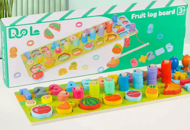 Логічна дерев’яна дошка C 74283 (20) цифри, фрукти на магнітах, магнітна риболовля, гра з кілочками, в коробці