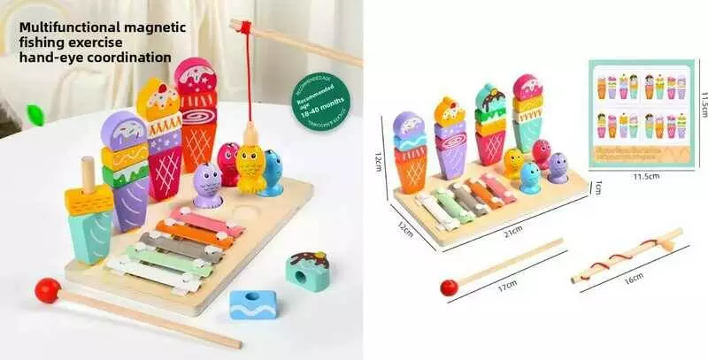 Логічна дерев’яна дошка C 75286 (48) 21х12 см, 3 гри: магнітна риболовля, гра з кілочками та ксилофон, дерев’яна вудочка, молоточок, в коробці