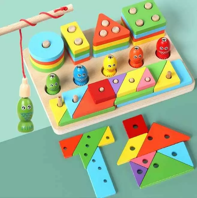 Логічна дерев`яна дошка C 75298 (30) геометричний сортер, танграм, сортер за кольорами, магнітна риболовля, 5 рибок, вудка, в коробці