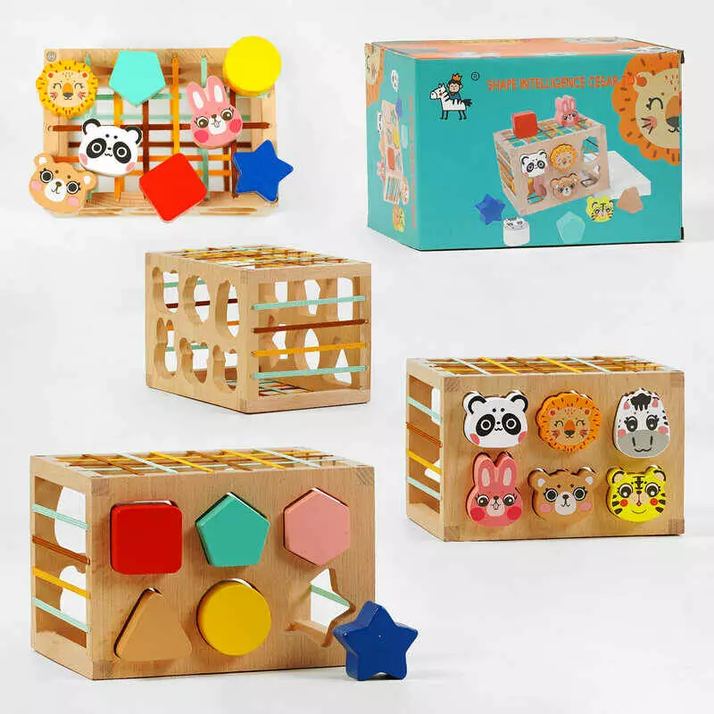 Дерев`яний геометричний сортер C 60392 (27) сортер тваринки, еластичні стрічки, дерев’яний куб, в коробці