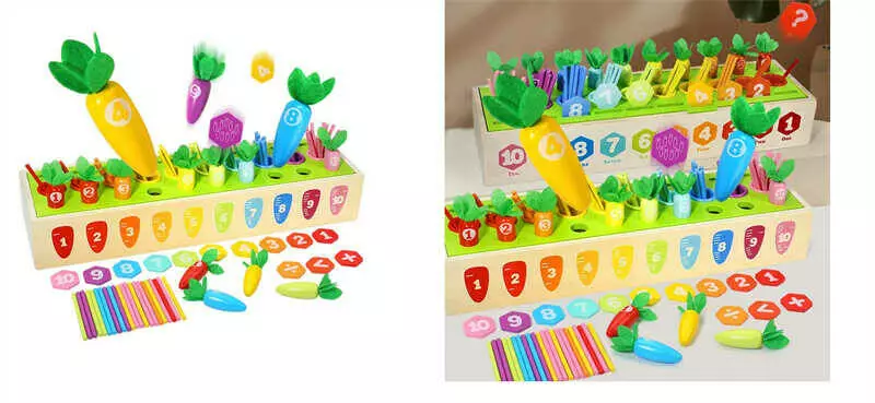 Сортер дерев`яний C 65660 (24) дерев`яна, математична, 10 комірок з позначеннями цифр, математичні символи, морквинки, кольорові відерця, в коробці