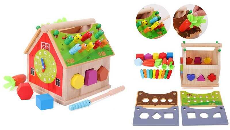 Логічний будиночок C 75555 (12) дерев’яний, годинник, сортер, геометричні фігурки, магнітна риболовля, гра з морквинами, в коробці