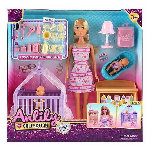Лялька 616308 (18) висота: 30 см, знімний одяг та взуття, 2 пупсики, ліжечко з балдахіном, ванночка, аксесуари, в коробці