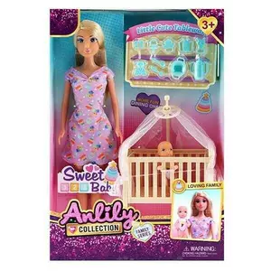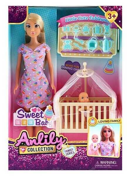 Лялька 616315 (24) висота 30 см, знімний одяг та взуття, немовля, дитяче ліжечко з балдахіном, набір посуду та іграшок для дитини, в коробці