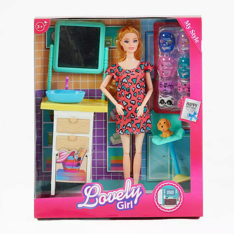 Лялька 785 C (48/2) умивальник з тумбою, стільчик з собакою, набір масок, висота ляльки 30 см, в коробці