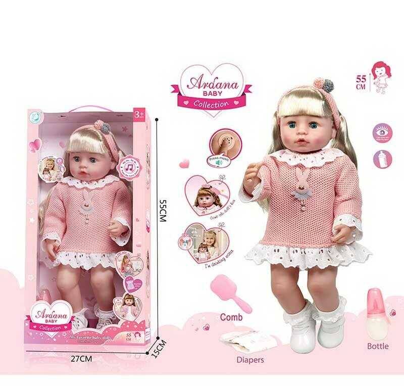 Лялька A 911 C (12/2) гумова, висота - 52 см, заплющує очі, функціональна, прошите волосся, пляшечка, підгузок, ходить на горщик, взуття, в коробці