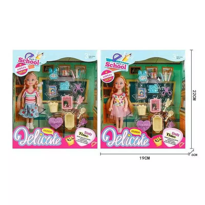 Лялька L 5-15 (96/2) 2 види, "Школа", будильник, ножиці, олівці, стаканчики, кошик, висота ляльки 14см, в коробці