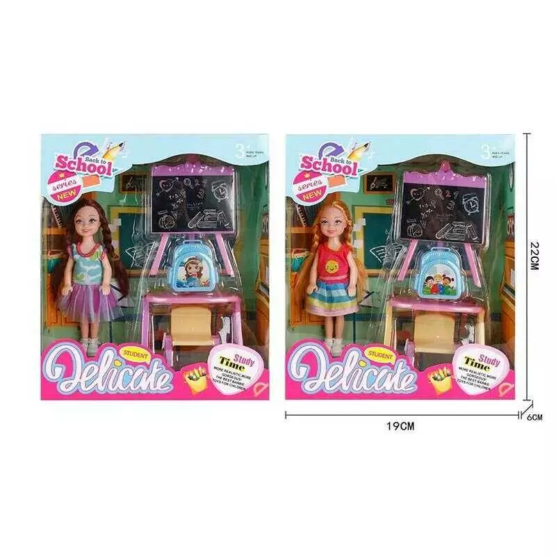 Лялька L 5-17 (96/2) 2 види, "Школа", дошка, ранець, парта, стільчик, висота ляльки 14см, в коробці