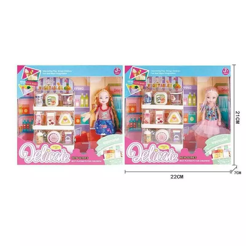 Лялька L 5-22 (96/2) "Супермаркет", полички з продуктами, висота ляльки 14см, знімний одяг та взуття, в коробці