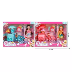 Лялька L 5-32 (96/2) 2 види, висота ляльки - 14 см, гумова голова, велосипед з морозивом та парасолькою, рюкзак, в коробці