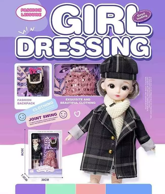 Лялька Q-A 33 (72/2) висота - 30 см, тіло — пластик, голова — гума, шарнірні з’єднання суглобів, знімне взуття, змінний одяг, аксесуари, в коробці