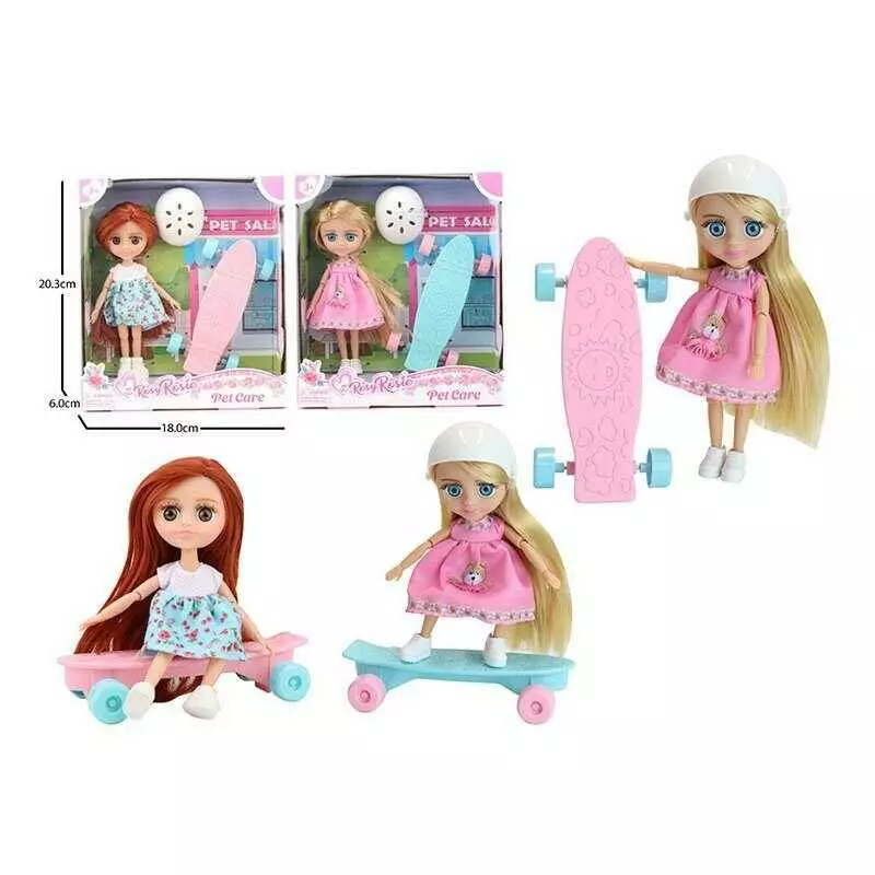 Лялька RR 034 (96/2) 2 види, висота: 16 см, шарнірні з’єднання, імітація скляних очей, знімний одяг та взуття, шолом, скейт, в коробці