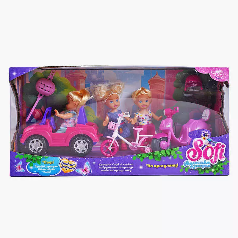 Набір ляльок Sofi 48501 (24/2) “На прогулянці”, 3 ляльки, машина, мопед, велосипед, 2 шоломи, в коробці