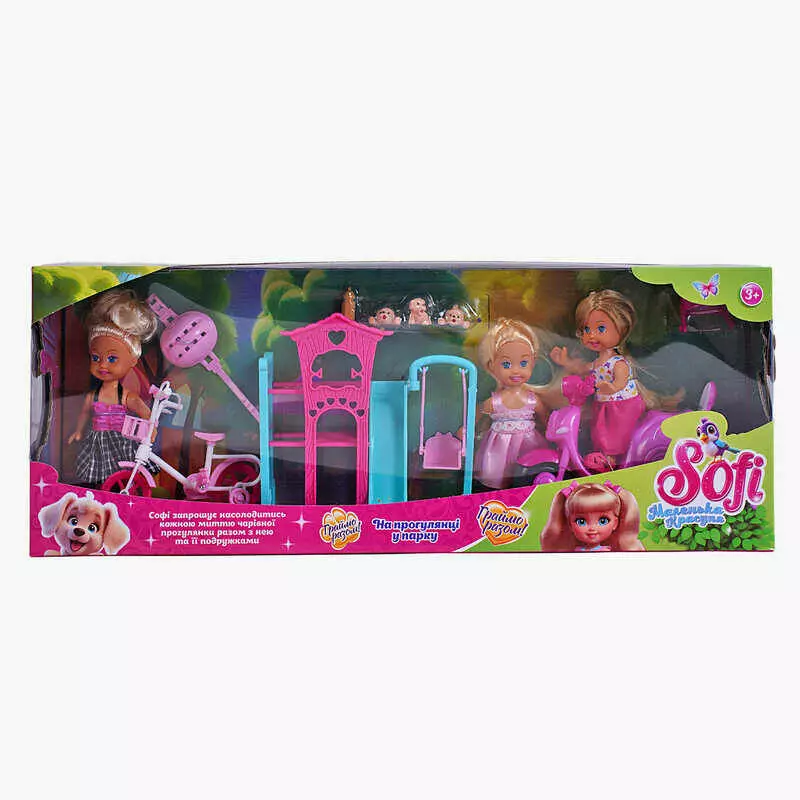 Лялька Sofi 85273 (36/2) “На прогулянці у парку”, 3 ляльки, мопед, велосипед, дитячий майданчик, висота ляльки 11 см, в коробці