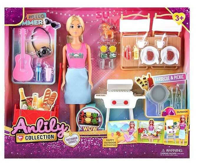 Лялька з аксесуарами 616256 (18) висота 30 см, знімний одяг, взуття, гриль, стільці, продукти, посуд, гітара, фотоапарат, улюбленець, візок, в коробці