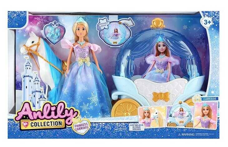 Лялька з каретою 616689 (6) висота ляльки 30 см, шарнірні кінцівки, намисто, пара взуття, корона, кінь із сідлом, карета, дах відчиняється, в коробці