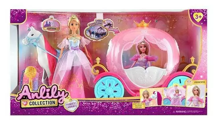 Лялька з каретою 616851 (6) світло, висота ляльки 30 см, шарнірні кінцівки, намисто, корона, кінь із сідлом, карета, дверцята відчиняються, в коробці
