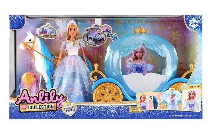 Лялька з каретою 616852 (6) світло, висота ляльки 30 см, шарнірні кінцівки, намисто, корона, кінь із сідлом, карета, дверцята відчиняються, в коробці