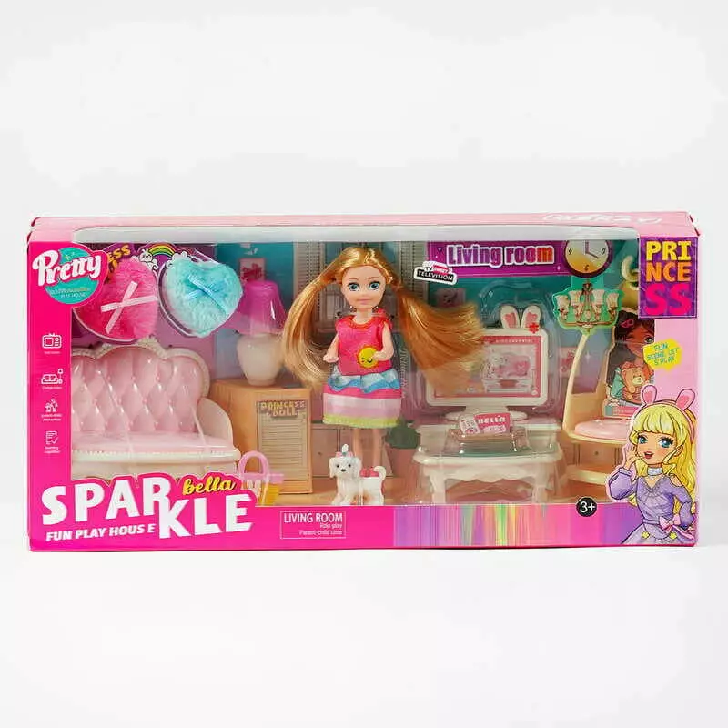 Лялька з меблями 7019 (32) висота 13 см, вітальня, аксесуари, улюбленець, меблі, предмети декору, в коробці