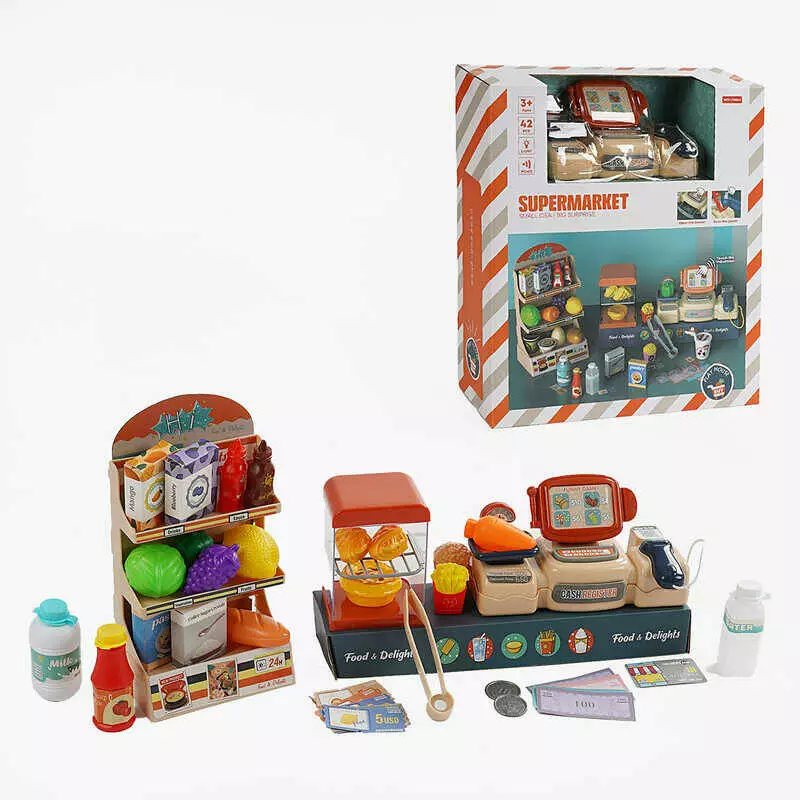 Магазин MW 5581 (16) касовий апарат, звук, репліки англ. мовою, підсвічування, стелаж, муляжі, прикраси, наліпки, в коробці