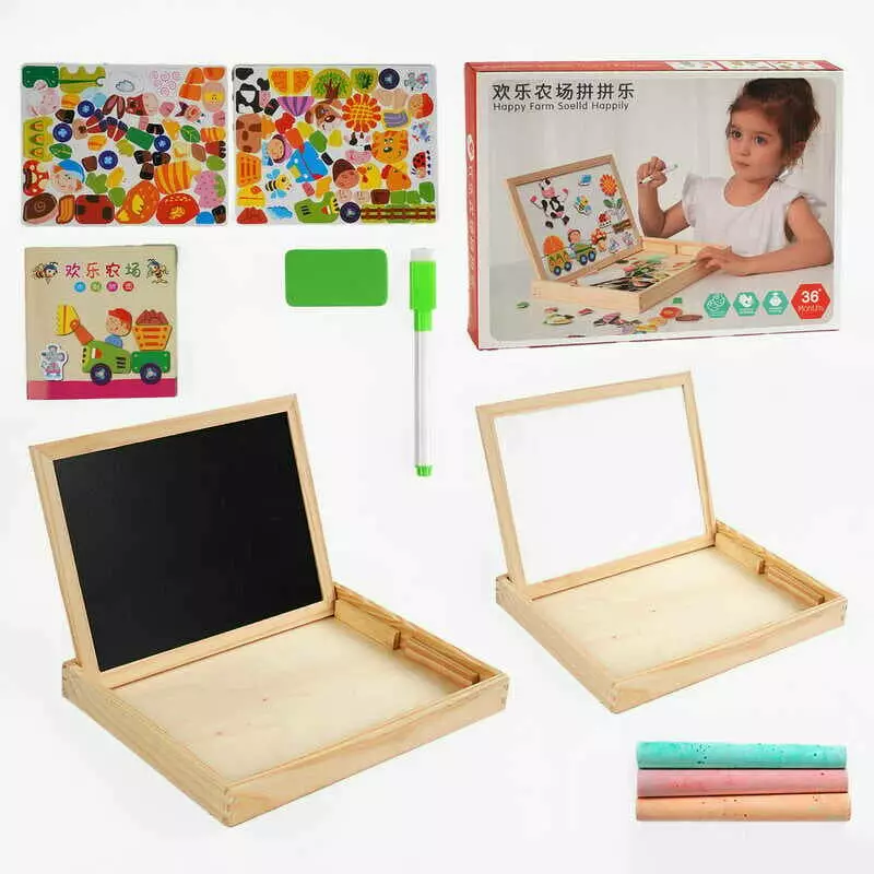 Дерев`яна магнітна дошка С 64032 (36) 2в1, двостороння дошка для малювання, крейда, маркер, 16 магнітів, в коробці