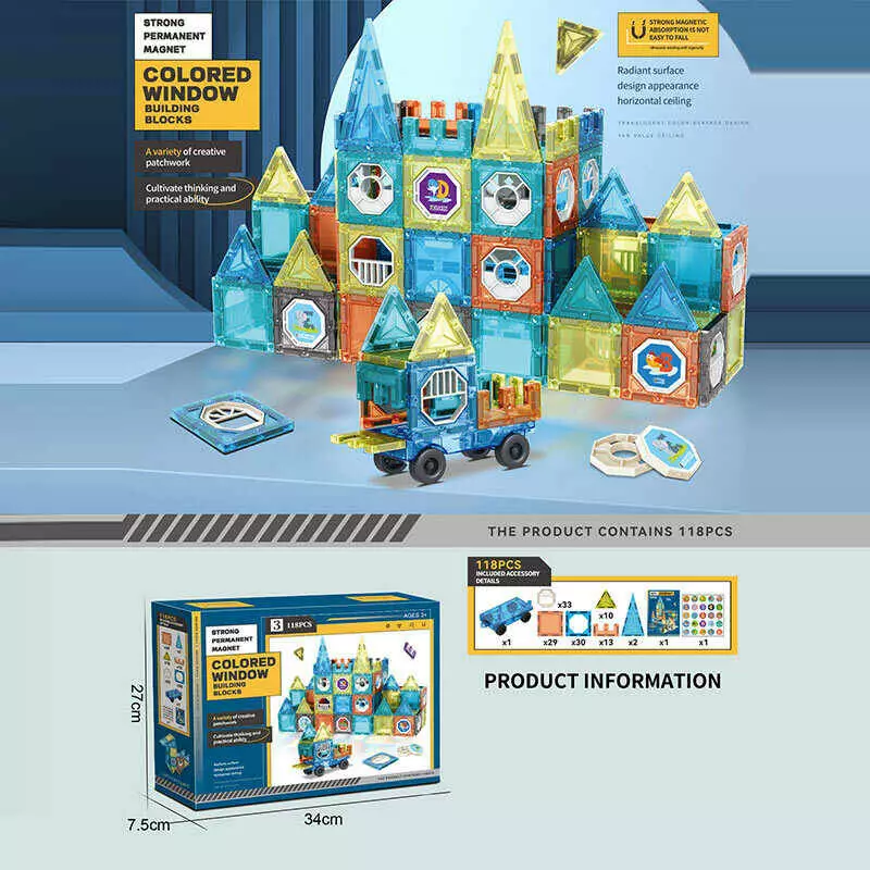 Магнітний конструктор 6687 A (18) 118 деталей, основа з колесами, віконця, в коробці