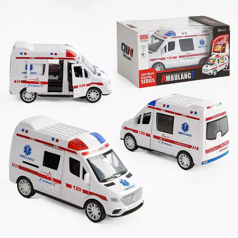 Машина 62925 (48) "Швидка допомога", мелодія, підсвічування, колесо вільного ходу, гумові шини, відкриваються двері, в коробці