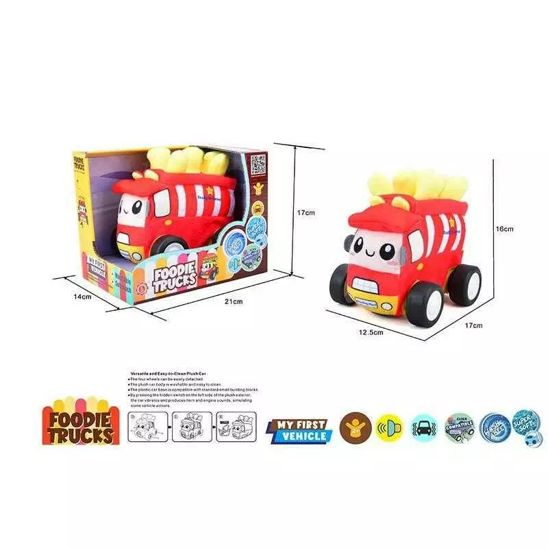Машинка м`яка QL 8106 C-5 (48/2) “Картопля фрі”, звуки транспорту, веселі мелодії, вібрація, знімний чохол, гумові шини, на батарейках, в коробці