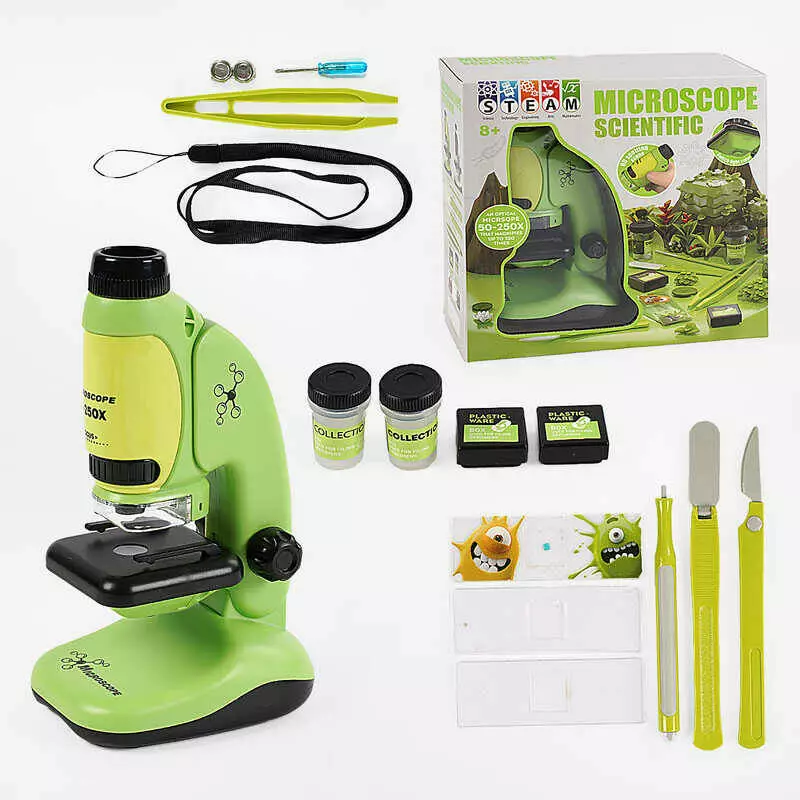 Мікроскоп 2209-1 (60/2) підсвічування, інструменти, 3 скельця, контейнери для зразків, викрутка, батарейки, інструкція, в коробці