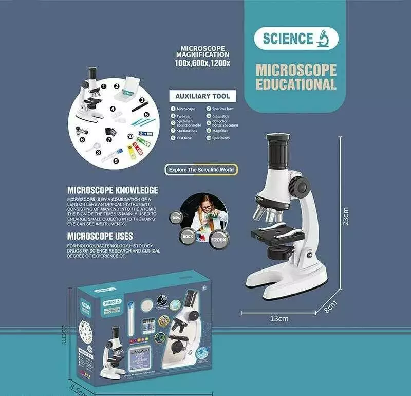 Мікроскоп 2227 A (36) збільшення 100х, 600х та 1200х, інструменти, лупа, скельця, підсвічування, на батарейках, в коробці