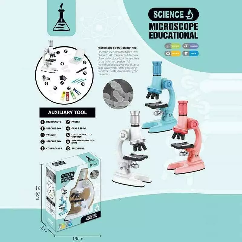Мікроскоп 3305 (36) 3 кольори, збільшення 100х, 600х та 1200х, інструменти, скельця, підсвічування, в коробці, ВИДАЄТЬСЯ ТІЛЬКИ МІКС ВИДІВ