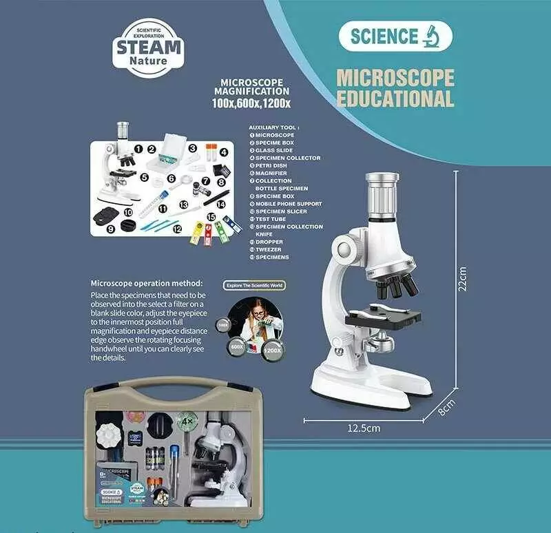 Мікроскоп 3306 (24) збільшення 100х, 600х та 1200х, інструменти, скельця, підсвічування, лупа, мірна колба, у валізі