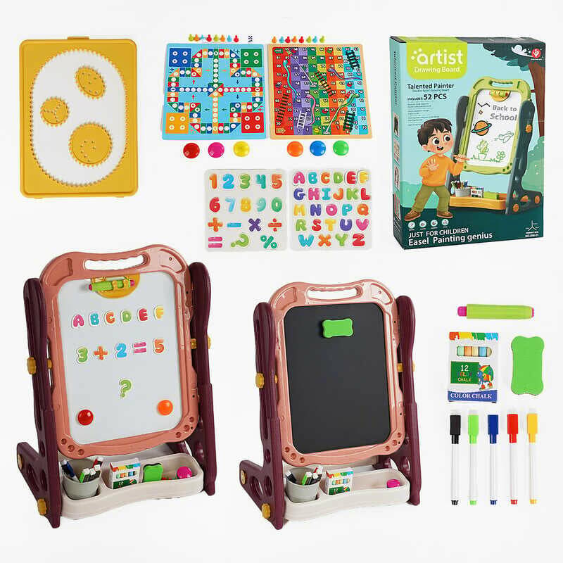 Мольберт 050-52 (18) двосторонній, крейда, маркери, стиранка, магніти, настільні ігри, фішки, в коробці