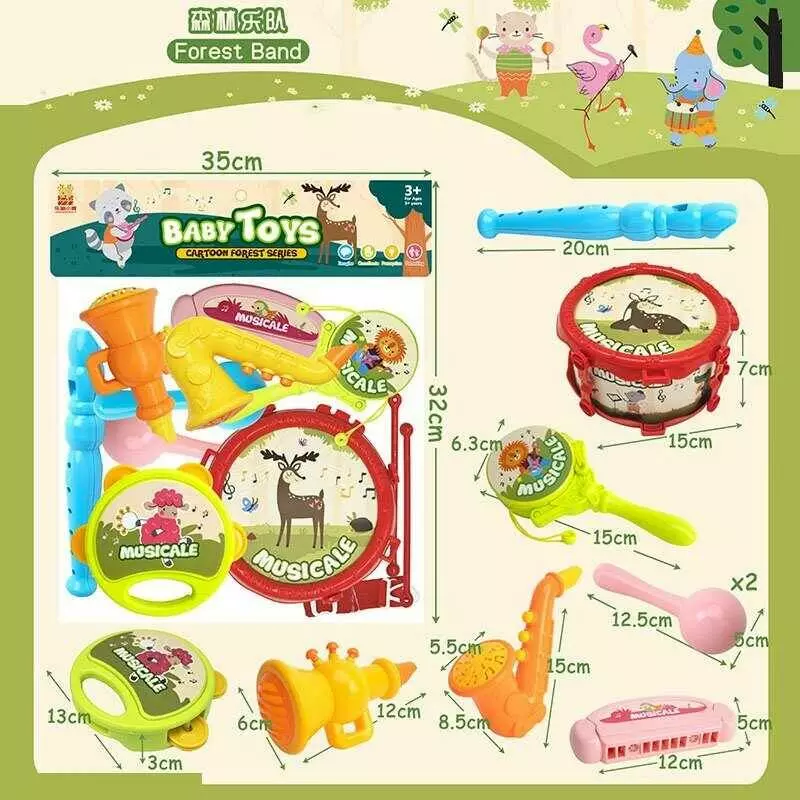 Музичні інструменти 667-3 (80/2) барабан, палички, гармоніка, бубон, саксофон, флейта, труба, гармоніка, маракаси, барабан - колотушка, в пакеті