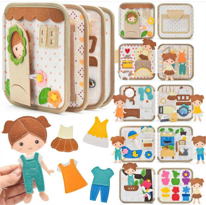 М`яка книжка-бізіборд С 75319 (36) 10 сторінок, фетрова лялечка, липучки, застібки, шнурки, гудзики, гардероб, одяг, ванна з дзеркальцем, в коробці