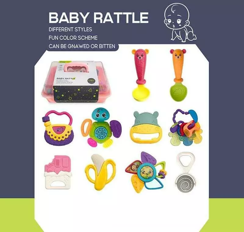 Набір брязкалець 8435-4 (60/2) 10 елементів, ложечки, гумові прорізувачі, пискавка, тріскачка, пальчикові ігри, дзеркальце, в боксі