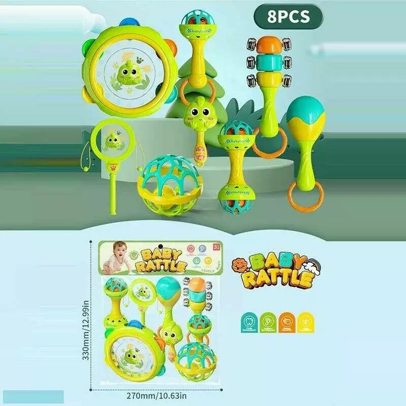 Набір брязкалець AT-022 (96/2) 8 штук, бубон, брязкальце - колотушка, маракас, брязкальце з дракончиком, брязкаючі елементи, в пакеті