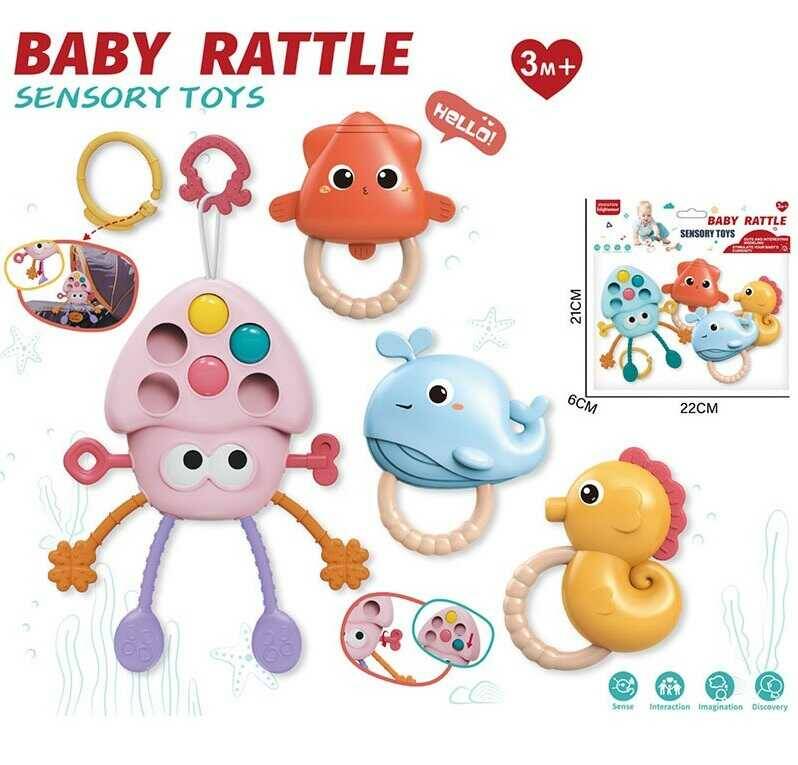 Набір брязкалець KLQ 529 A (120) “Морські мешканці”, 4 штуки, брязкаючі елементи, гумові прорізувачі, тріскачка, мотузочка, кнопочки, в пакеті