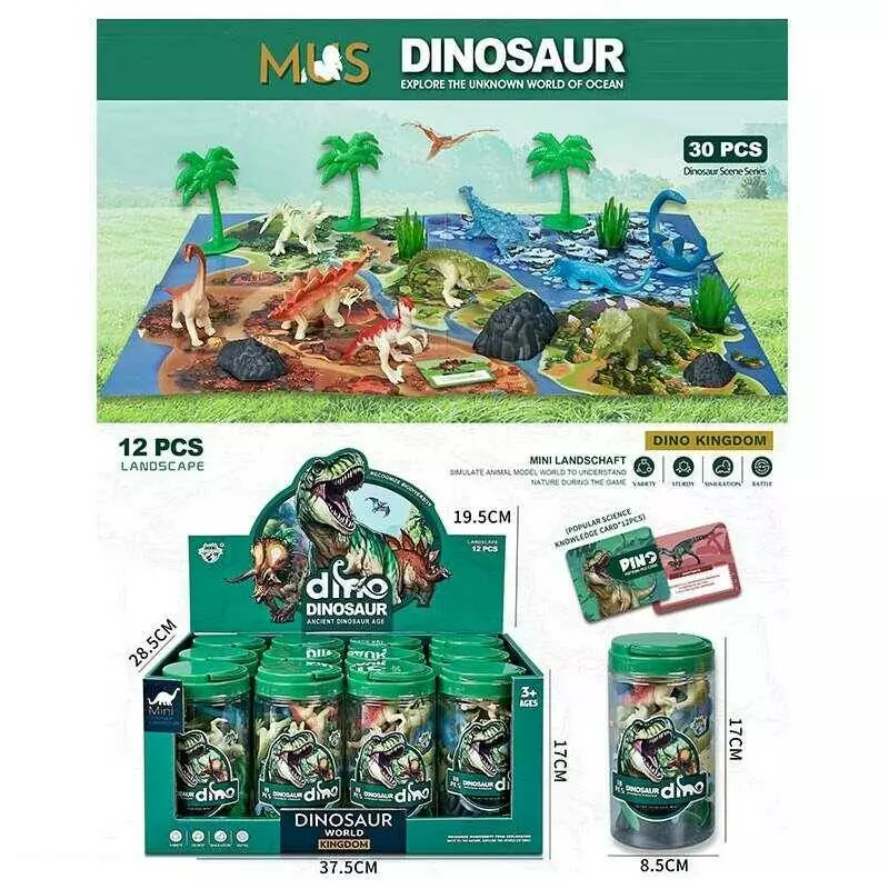 Набір динозаврів E 034-1 (6) ЦІНА ЗА 12 ШТУК В БЛОЦІ “Динозаври” 30 елементів, динозаври, аксесуари, картки, карта, в тубі