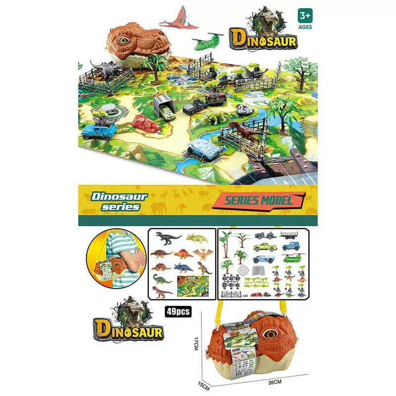 Набір динозаврів SY 9964 (36/2) 49 ел., 10 фігурок динозаврів, декорації, 4 машинки, гвинтокрил, тканинне ігрове поле, регульований ремінець, в бок