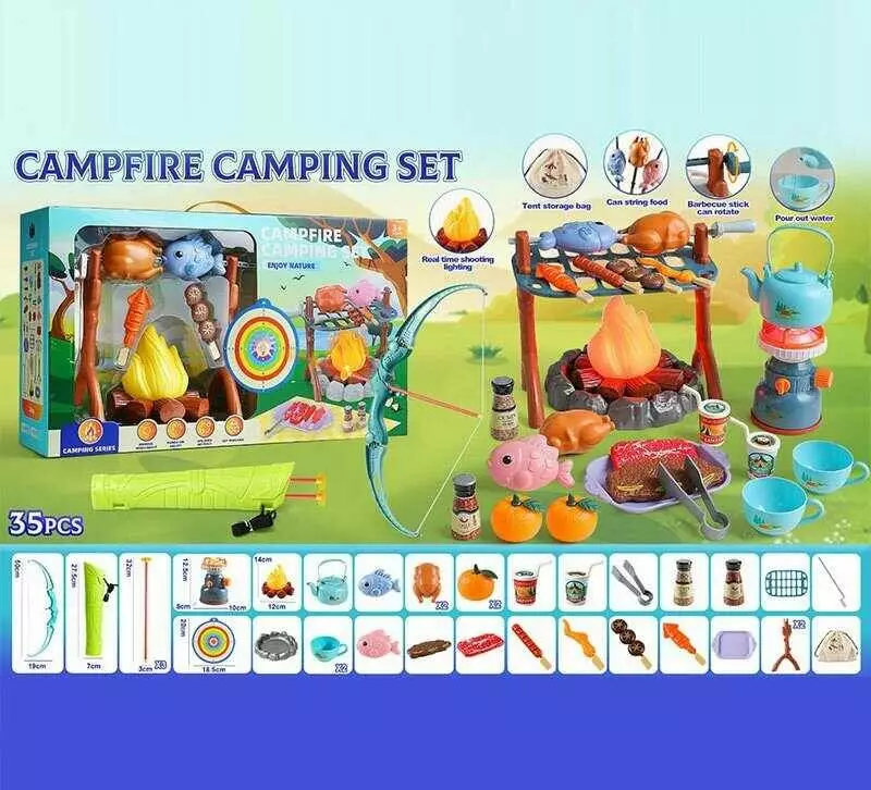 Набір для пікніку 877 A-32 (18) 35 елементів, газовий балон та вогнище зі світлом та звуком, лук, стріли, колчан, мішень, посуд, продукти, в коробці