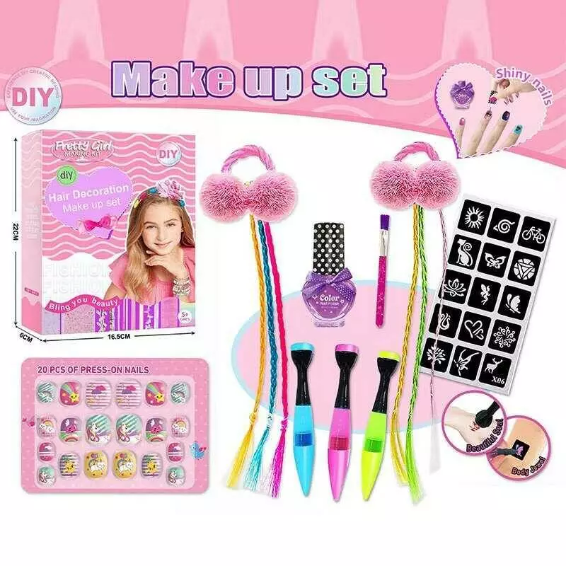 Набір прикрас L 5304 (120/2) 3 ручки з блискітками, прядки, резинки, лак для нігтів, наліпки, в коробці