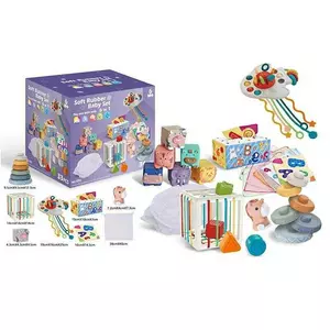Набір для розвитку 1296 (18) 34 елементи, кубики, брязкальця, прорізувачі, фігурка, пірамідка, серветки, мішечок, куб із формами, в коробці