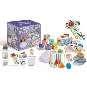 Набір для розвитку 1299 (18) 34 елементи, кубики, брязкальця, прорізувачі, фігурка, пірамідка, серветки, мішечок, куб із формами, в коробці