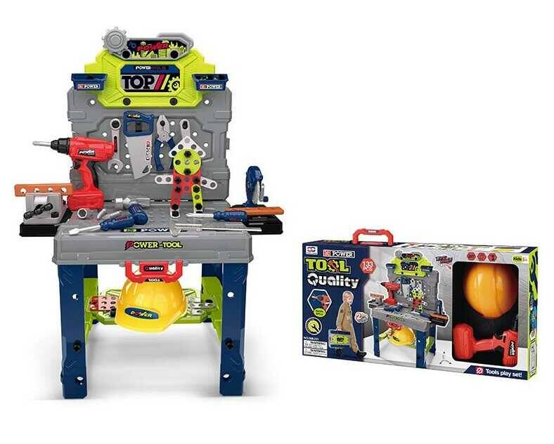 Набір інструментів 008-201 (8) конструктор,шуруповерт обертається,реверс, верстат,каска,валіза,молоток,тиски,пилка,викрутки,штангенциркуль, в коробці